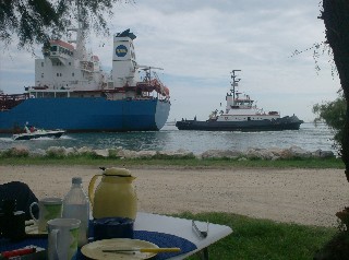 Die letzte Urlaubswoche bricht an. Beim Frühstück hören wir die Glocken von Venedig, und während des Palimpalims kommt Leben in die Fahrrinne direkt vor uns. Wie am Nordostseekanal.