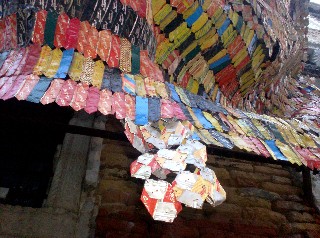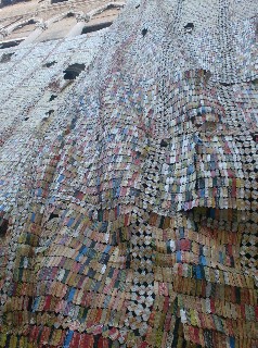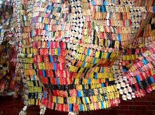 Bei genauer Inspektion entpuppt sich die verschlissene Verpackung als Vorhang aus Getränkedosenplättchen. Die unteren sind einwandfrei Coladosen. Lusdische Kunst.
