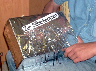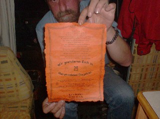 Abendessen kochen ist nun nach der Flasche Prosecco nicht mehr drin, aber wir haben noch einen Rest Linsensuppe und Specksauerkraut. Zusammengekocht ists ein leckeres Süppchen, das bestimmt noch nie jemand an seiner Silberhochzeitsfeier gehabt hat. Geplant war eigentlich Rahmgeschnetzeltes mit handgeschabten Spätzle. Egal, schmegge musses, und es hat geschmeckt.