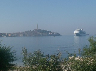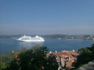Als ich aus der Dusche komme, liegt plötzlich ein Riesendampfer in der kleinen Bucht. Bin richtig erschrocken.