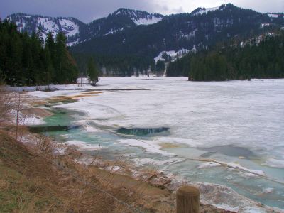 Der See liegt noch unter einer dicken Eisschicht, die nur am Rand etwas aufgeweicht ist.