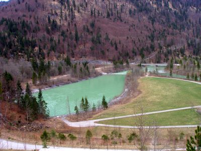 Rechts sieht man, wie sich die Isar auf den weiteren Weg macht, denn sie ist eigentlich der Wasserlieferant für den Sylvensteinstausee, genau wie auch für den Walchensee, den wir morgen noch besuchen müssen.