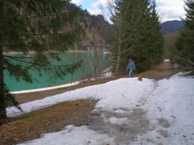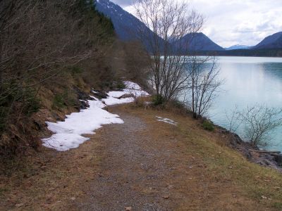 Auf dem Stellplatz in Fall stehen schon 4 Womos, und er ist heute einladender als letztes Mal. Er wurde erweitert und man muss nicht mehr im Wald auf kleinen Wegen stehen. Nun machen wir uns auf die Suche nach dem Einstieg zum Seeuferweg, finden ihn auch, aber wie wir schon befürchtet haben, liegt hier noch Schnee und der Weg endet plötzlich. Also bleiben wir doch nicht hier, denn wir wollten ja ein wenig wandern morgen.
