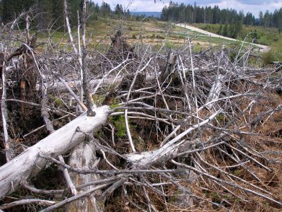 Hier wurde eine 10 Hektar große Sturmwurffläche des Orkans Lothar vor 9 Jahren sich selbst überlassen, um die natürliche Regeneration in diesem Bannwald zu beobachten.