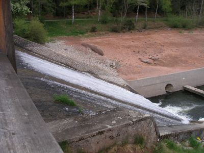 Der Vorspeicher ist voll, und wir schauen dem Wasser zu, wie es langsam über die Staumauer in den Hauptspeicher fließt.