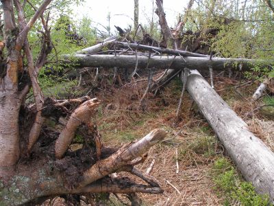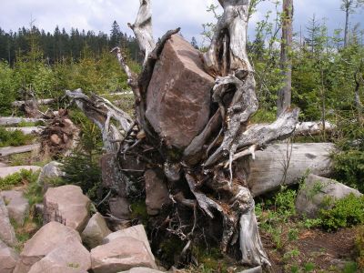 Hier am Wurzelwerk kann man gut sehen, dass ein Flachwurzler kaum Chancen hat, so einen Orkan zu überstehen.
