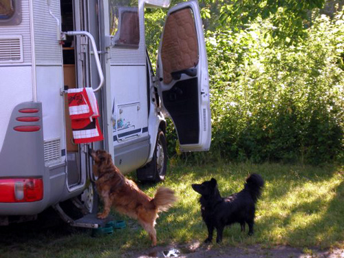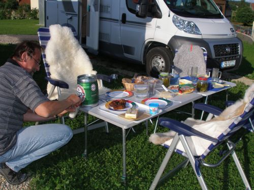 So gestärkt gehts wieder unter den duftenden Linden zum Stellplatz zurück, wo Bruno gleich nachsehen muss, ob die Nachbarin noch ein Leckerli hat.