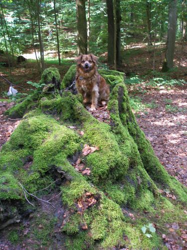 Hier sind wir auf einem Keller und Bruno sitzt in einem Baumstumpf.