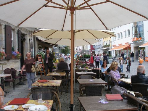 Nun gehts wieder runter in die Stadt, die heute richtig lebendig ist. Schon um die Mittagszeit sitzen die Leute gemütlich in den Biergärten und Straßencafes.