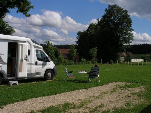 Das Gasthaus hat Montag und Dienstag Ruhetag, aber ein Bier kriegen wir trotzdem. Der Stellplatz liegt oberhalb der Brauerei und wir haben rundherum Aussicht auf Felder und Wiesen. Urlaub.