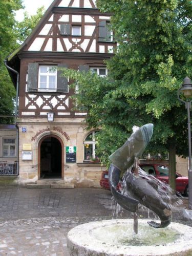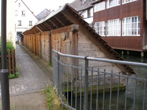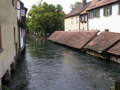 und dann gehts über die Hundsbrücke über die Wiesent. Hier hängen wohl seit Jahrhunderten schon die Fischkästen im Wasser, die den Fischern zur Aufbewahrung des Fanges dienen. Leider sind die Hütten alle abgeschlossen und auch durch die Ritzen kann man nix erkennen. Schade.