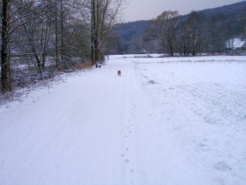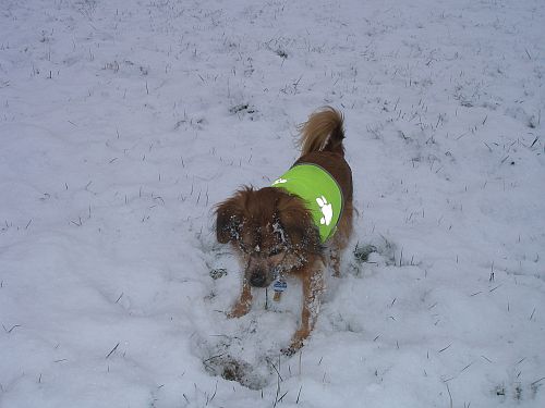 Ich erbarme mich und wage mich mit ihm hinaus in die Winterlandschaft, und Bruno hat sehnsüchtig aufs Leinen-los-Kommando gewartet und gibt sofort Gas, dass der Schnee nur so staubt.