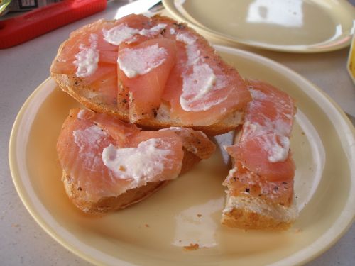 Mittags gibts zur Aufmunterung lecker Lachsbrötchen.