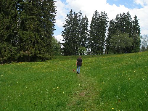 Dann müssen wir wieder los, denn wir sind ohne Jacken unterwegs und der Himmel zieht sich zu. Den Rückweg kürzen wir daher ab und nehmen den oberen Weg durch die Wiesen, erst bergauf, dann bergab.