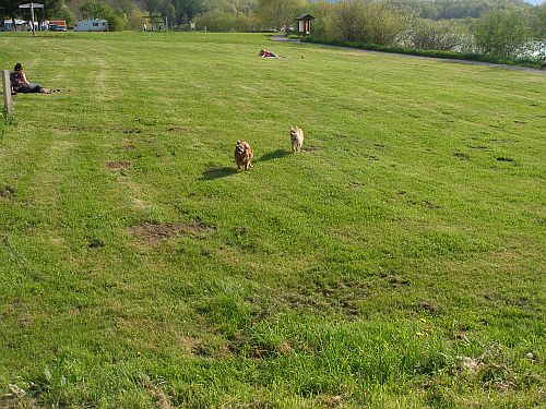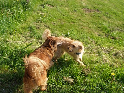 Irgendwie ist das Bild verpixelt, aber Bruno ists egal. Ohne Rücksicht auf Verluste gehts quer über die Liegewiese, das macht richtig Spaß. So getobt hat er lange nicht mehr.