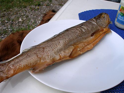 Zum Abendessen bekommt Peter den restlichen Gulasch von gestern, und ich hol mir schnell wieder eine Forelle. Dazu gibts Spargelsalat.