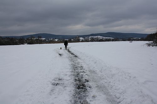 Heute schneit es mal nicht, aber die Spazierwege sind entweder gesalzen oder nicht geräumt und nicht zu finden. Bruno versinkt im Schnee und wir gehen immer nur den gleichen Weg. Und eigentlich bin ich diesen Weg letztes Jahr 4 Wochen lang täglich gegangen.