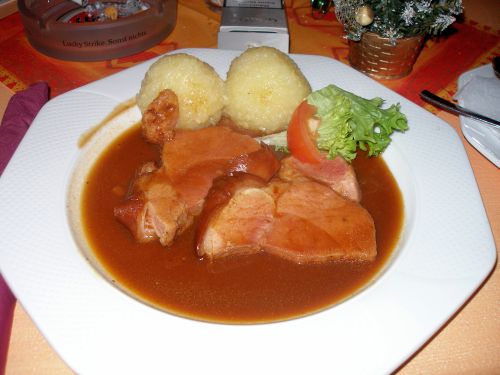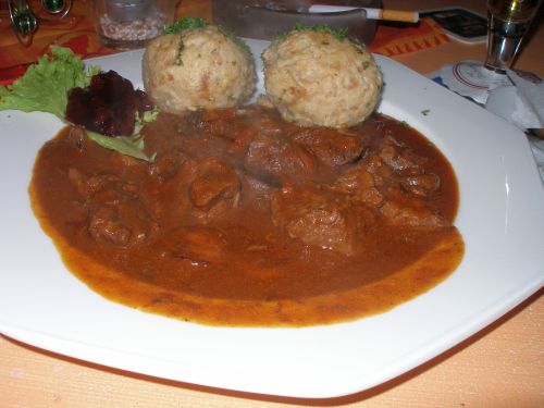 und bei mir gibts Wildschweingulasch mit hausgemachten Semmelnknödeln und Apfelmus. Leider ist mein Teller etwas übergeschwappt und sieht nicht so schön aus, geschmeckt hats trotzdem.