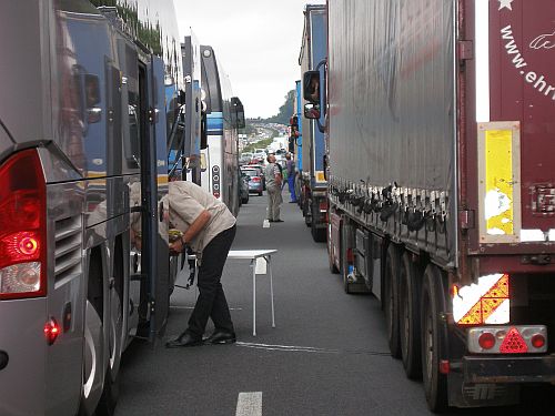 Nach dem Frühstück - gegen 12:00 - machen wir uns auf den Weg zur Heide. Aber wir kommen nicht weit. Nach ca. 5 km Autobahn stecken wir in einer Vollsperrung. LKW- Bergungsarbeiten. Vielleicht hätten wir doch um 8:00 aufstehen sollen. Dann säßen wir jetzt bestimmt schon in Winsen vorm Womo.