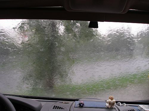Eine Stunde später löst sich der Stau ruckzuck auf und wir haben freie Fahrt. Aber zu früh gefreut. Ein Wolkenbruch zwingt uns auf den nächsten Parkplatz