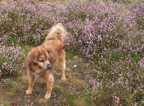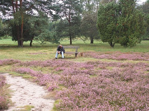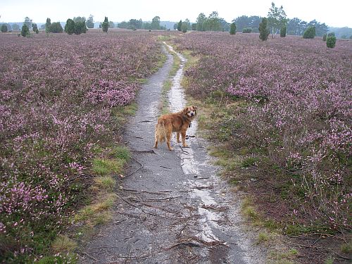 Peter macht inzwischen ein Nickerchen, während Bruno ohne Leine mit mir die Heide durchstreift. Auch hier sind wir wieder mutterseelenalleine und er darf springen. Aber bis zum Wald gehn wir nicht, denn nun fängts wieder an zu tröpfeln. Das waren aber jetzt auch genug Heiden für heute und wir sind hungrig.