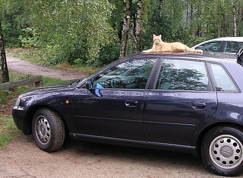 Nun kommen wir an die Niederroher Heide. Auch hier ist wieder ein sehr schöner Parkplatz, auf dem man übernachten könnte. Eine zierliche aber selbstbewusste Katze mit Halsband stromert hier rum und legt sich dann auf Nachbars Autodach.