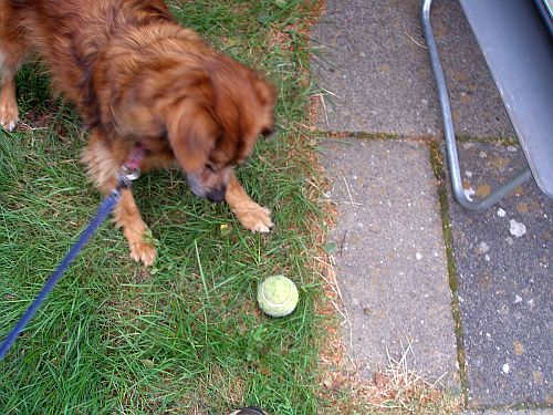 sich seinen Ball aus der Garage geholt und versucht verzweifelt alleine damit zu
