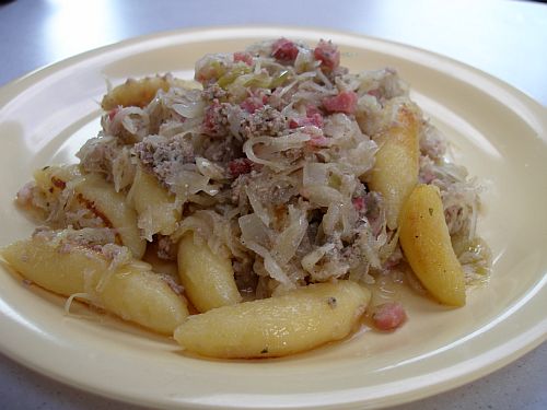 Gegen 18:00 wirds uns draußen zu frisch und wir gehen rein. Heute gibts Specksauerkraut mit Schupfnudeln. Und als Krönung wird noch ein gepelltes Leberwürstchen mitgekocht. Da war gestern das MHD erreicht und es musste weg.