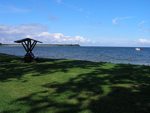 Bei allerwunderbarstem Ostseesommerwetter verbringen wir einen Faulenzertag auf dem allerwunderbarsten Stellplatz an der Ostsee. In der Snack-Bar gibts einen Cappu, später ein Backfischbrötchen, und alles mit Blick aufs Wasser. Zum Leidwesen der Kiter hält sich der Wind in Grenzen, und das genießen wir. Das ist wirklich Urlaub.