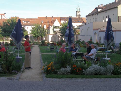Zum Abendessen sitzen wir im sehr schön angelegten Park vor der Gaststätte Malteser.