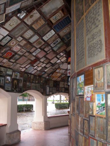 Sehr interessant und beeindruckend ist auch der Kreuzgang außen rum, der über und über mit Dankestäfelchen behängt ist. Auf einer Seite hängen etliche Beinschienen kleiner Kinder mit entsprechenden Danksagungen und es ist ein beklemmendes Gefühl, die Dinge anzuschauen.