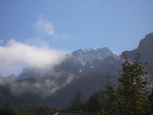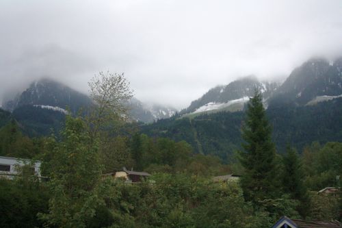 Gegen 13.00 checken wir auf dem Campingplatz Grafenlehen ein, finden einen Platz mit Blick auf die in den Wolken versteckten weiß gepuderten Berge,