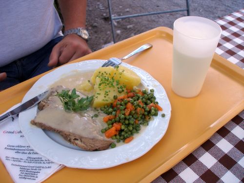 Gekochte Ochsenbrust mit Meerrettich. Dazu gibts ein Glas frische Buttermilch. Diesem Ochsen bleibt der Almabtrieb per Boot erspart.