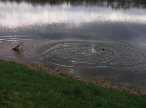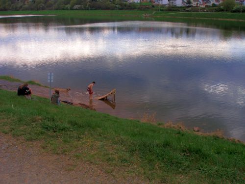 Der Himmel bewölkt sich und am See unten wirds lebendig. Unerschrockene Jugendliche karren eine Rampe herbei und platzieren sie im Wasser.