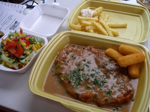 Das Abendessen ist heute Peters Angelegenheit. Er bestellt beim Schnitzeltaxi und ne gute halbe Stunde später ists da..