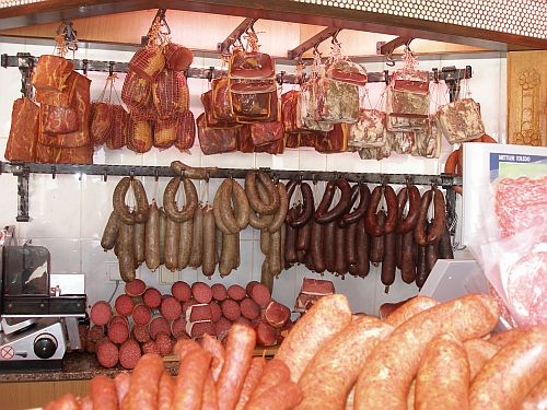 War ein toller Tipp und ein Erlebnis, die Metzgerei zu sehen. Alles hängt voller Würste, alle Sorten, geräuchert und luftgetrocknet, eine schöner als die andere. Und durch die Pendeltür kann man manchmal einen Blick auf den hinteren Raum werfen, der bis unter die Decke mit Würsten vollgepackt ist. Leider war der Laden voll und ich konnte nicht gut einfach so rumfotografieren, aber eine Ecke hab ich dann doch schnell geknipst.