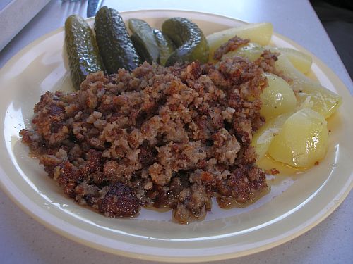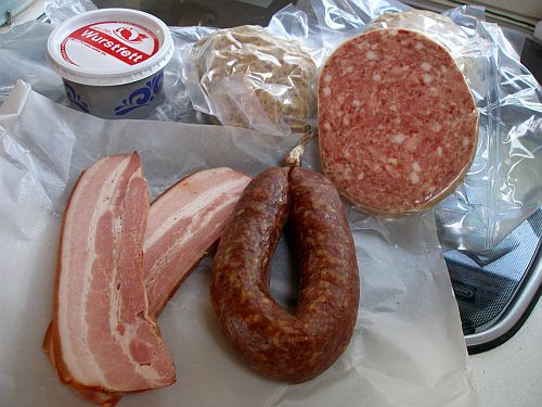 2 große Scheiben gekochter Bauch, 1 runde ahle Worscht, 1 dicke Scheibe Schwartenmagen, eine Dose Wurstfett und zweimal ein Pfund Weckewerk, das uns die nette Verkäuferin eingeschweißt hat, damit wir es nicht gleich auf einmal essen müssen. Und alles zusammen für nur 13 €. Wir waren erstaunt, denn ich hab mit wesentlich mehr gerechnet.