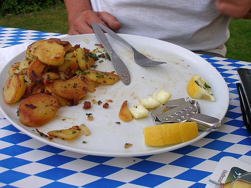 Peter hat zum ersten Mal in seinem Leben Reste auf dem Teller gelassen. Er war pappsatt. Mit 2 Weizen und einem Pils haben wir insgesamt 23 € bezahlt. Passt. Mal sehen, ob ich morgen endlich mal wieder koche, oder lieber noch mal die Bergtour auf mich nehme.
