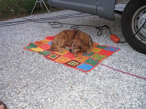 Auch Bruno hat Probleme, ihm tun vom Schotter die Füßchen weh und er sitzt freiwillig auf seiner Decke, was selten vorkommt.