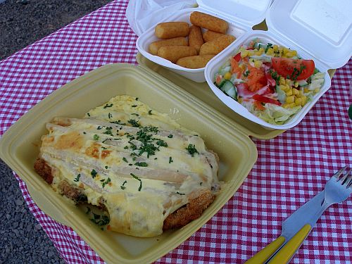 Zum Abendessen bestellen wir das Schnitzeltaxi