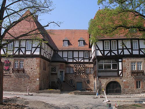 Blick vom Festungsgraben aus auf das Schloß, in dem nun die JVA Schwalmstadt untergebracht ist. Die Panzersperren vor dem Tor wurden installiert, nachdem ein dreifacher Mörder mithilfe eines Panzers befreit wurde.