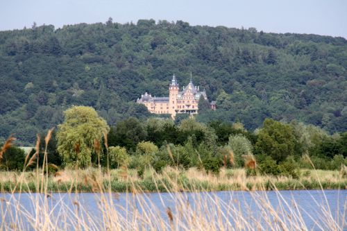 Ich sitz trocken, hab Blick aufs wogende Schilfgras, den heute nicht ganz so blauen See und das Schloss Wolfsbrunnen, das einer russischen Ärztin gehört, die es zu einem Hotel ausbauen ließ.