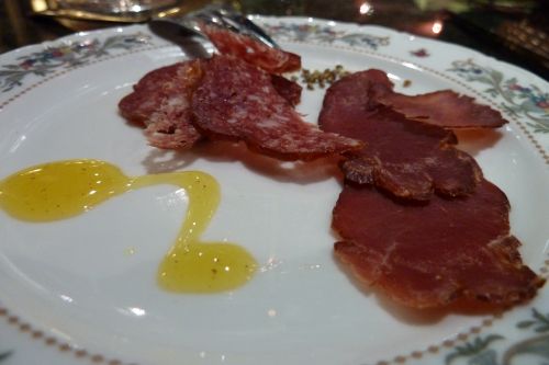 Gut wars. Aber wir wollten ja eigentlich satt werden. Das dachte sich noch einer, denn ein uns gänzlich Unbekannter schickte uns noch einen Gruß aus der Küche. Wildsalami und Wildschinken. Und dazu gabs ne leckere süße Pfütze, damit es nicht ganz so wild war.