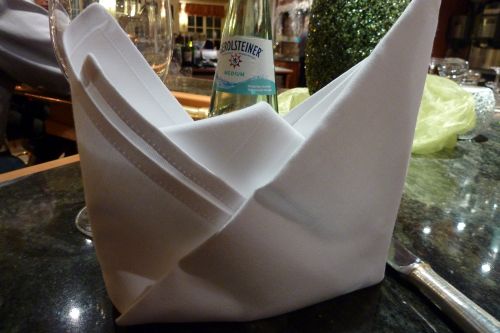 Zuerst brachte man uns einen weißen Hut, den wir aber nicht aufgesetzt haben, denn so alleine am Tresen mit Hut kommt man sich doof vor, wenn der ganze Speisesaal zuschaut.
