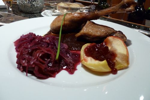 Peter hatte eine Gänsekeule an Beifussjus mit Preiselbeerapfel, Rotkraut und Klößen. Und weils hier vornehm zu geht, lag noch ein Schnittlauchröhrchen quer drüber. Schick. Peter hats mitgegessen.