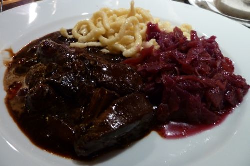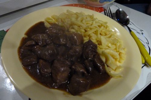Zum Abendessen gibts heute Rotweingulasch, Spätzle und gemischten Salat,