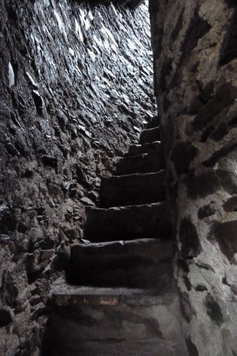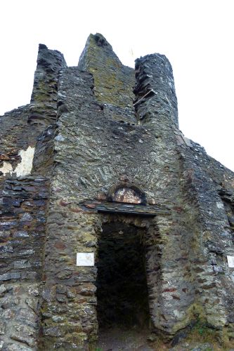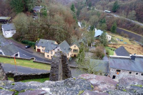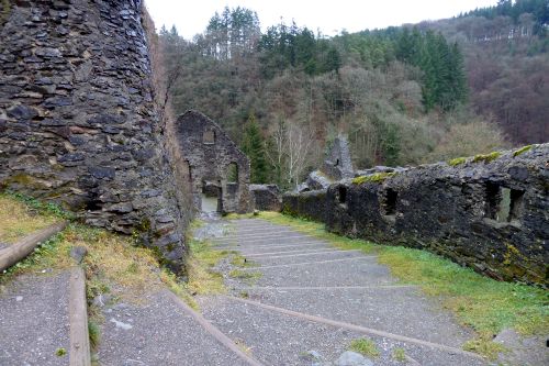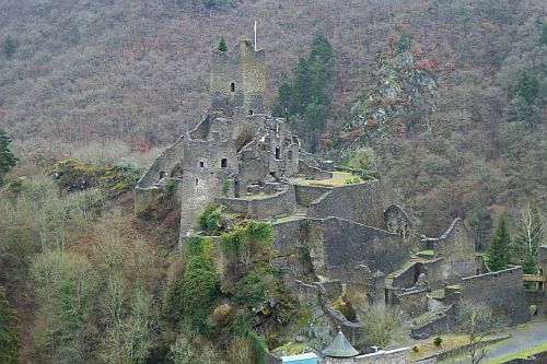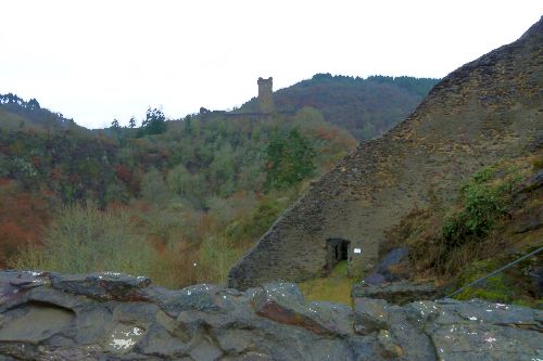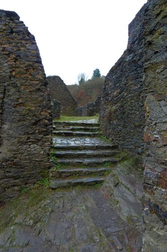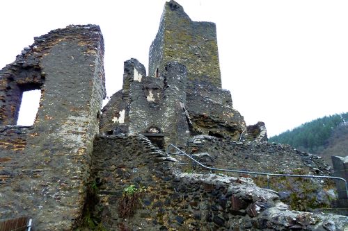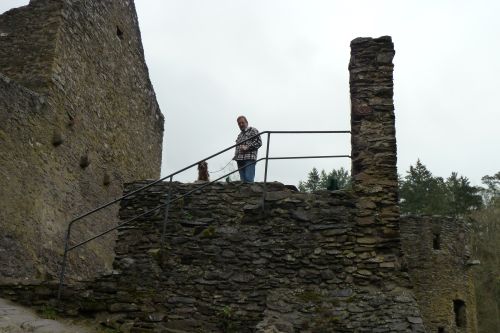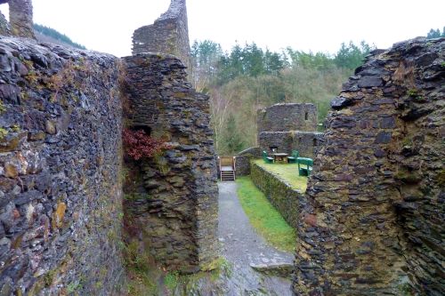 Gegen Mittag fahren wir weiter, verwerfen das Ziel Bad Kreuznach, und fahren zur Burg Manderscheid. Und das war auch gut so. Bisher war der Parkplatz immer voll und wir kamen nie dazu, die alten Mauern anzuschauen. Heute ists Wetter so grau wie die Wälder und die dicken Mauern, und deshalb gehört die Burg uns allein.