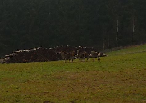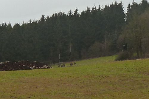 Unterwegs begegnet uns ein Rudel Hirsche. Sie bleiben zwar stehen, aber bis ich meine Kamera soweit habe, rennen sie wieder ein Stück weiter, um dann mit riesigen Sprüngen abzudüsen.