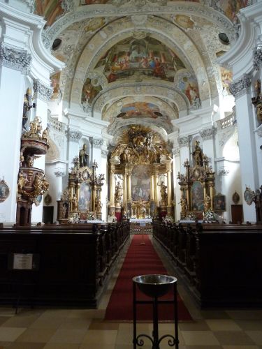 Hier ist absolute Menschenleere, und deshalb wird Bruno unten an der Treppe hingesetzt und wir können mal gemeinsam die Klosterkirche ansehen. Man darf aber garnicht richtig rein, und fotografieren ist auch verboten.