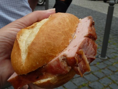 Peter holt beim Metzger unser verspätetes Mittagessen.